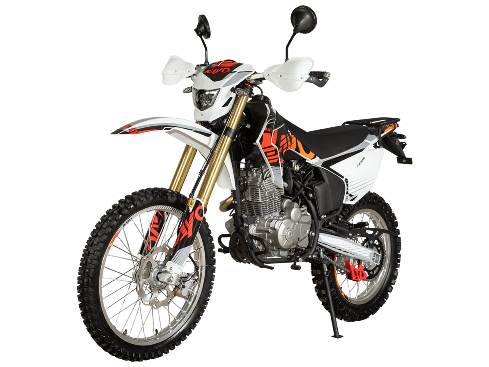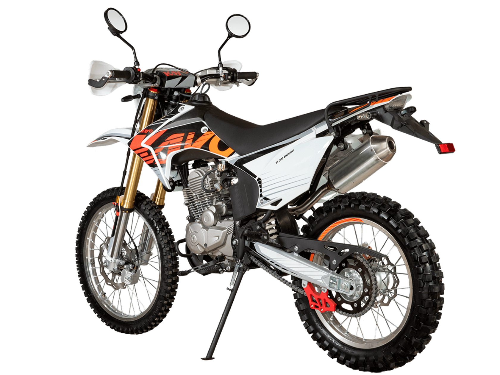 Мотоцикл KAYO T1 300 Enduro 21/18 2025 ПТС – надёжный и производительный эндуро, готовый встретить вызовы внедорожных трасс.Оснащён 4-тактным двигателем объёмом 271 см³ с верхним распредвалом и воздушным типом охлаждения. Максимальная мощность в 24 л.с. развивает при 8500 об/мин, а максимальный крутящий момент 22 Нм при 6500 об/мин. За подачу топлива отвечает карбюратор PD30. Он обеспечивает плавность хода, топливную экономность и бесперебойную работу двигателя даже в самых жёстких условиях. Соотношение диаметра цилиндра и хода поршня 75,0х61,4. Степень сжатия 9,29:1. Запуск двигателя осуществляется с помощью электростартера или кикстартера. Тип зажигания CDI. Снизу установлена пластиковая защита двигателя.Механическая коробка передач имеет 5 ступеней. Привод цепной. Объём топливного бака 9 литров.На мотоцикл установлены спицованные колёса с алюминиевыми ободами, алюминиевыми ступицами и буксаторами. Обуты во внедорожные покрышки YUANXING 80/100-21 и 110/100-18.Длина подвески спереди 880 мм, длина задней подвески 380 мм. Задняя подвеска оснащена прогрессией. Траверсы выполнены из литого алюминия, а прогрессия – из стали. За торможение отвечают дисковые гидравлические тормоза.Прочная рама и маятник выполнены из стали. Мотоцикл имеет ПТС и оснащён всем необходимым для поездок по дорогам общего пользования: диодная светотехника (яркая фара, поворотники, стоп-сигнал), звуковой сигнал, цифровая приборная панель, зеркала заднего вида.Для управления установлен руль переменного сечения 28 мм Fatbar со стандартными рычагами сцепления и тормоза, на который установлена алюминиевая защита рычагов с широкими ветрозащитными щитками. Имеется платформа для перевозки грузов и дополнительные подножки для поездок с пассажиром.Габариты мотоцикла 2100х810х1180 мм, вес 119 кг. Клиренс 340 мм, колёсная база 1420 мм, высота по седлу 900 мм.