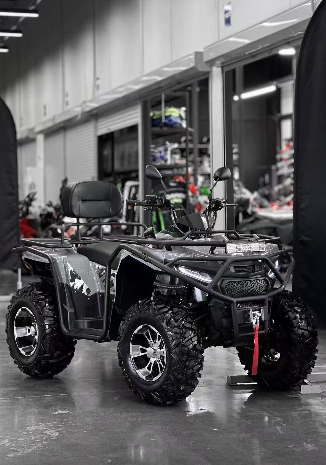 Комплектация Багажник: Сзади и спереди; Лебедка: Есть (управление кнопками на руле); Светодиодные фары головного света (ближний-дальний свет), задний габарит/стоп-сигнал, поворотники, «аварийка»