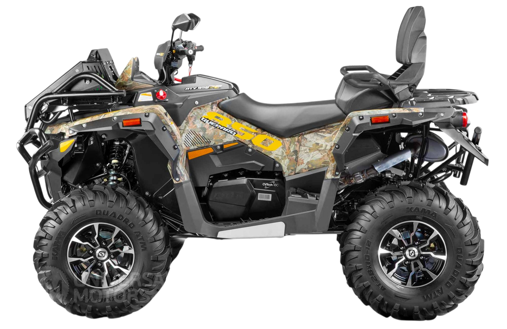 • Мощь флагманского двигателя 850 см³: Сердце квадроцикла — невероятно мощный и тяговитый двигатель, который обеспечивает уверенное движение по грязи, песку, снегу и крутым подъемам. Вариаторная коробка передач (CVT) делает управление простым и интуитивным, а выносной радиатор гарантирует стабильное охлаждение даже на самых низких скоростях.