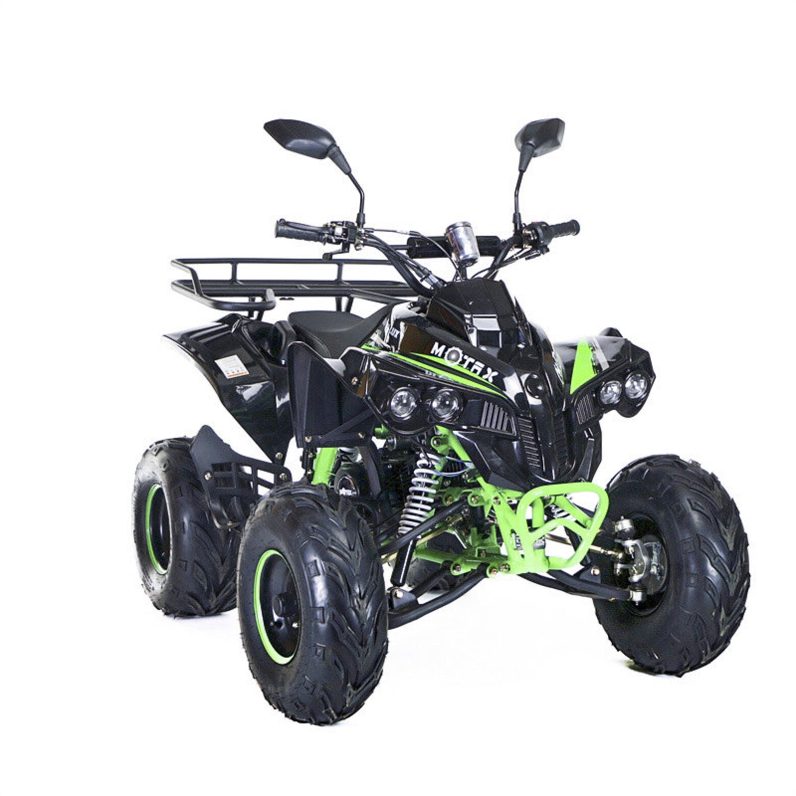 Квадроцикл подростковый бензиновый MOTAX ATV Raptor Super LUX 125 сс Черный (Зеленая рама)Комплектация 7: Коробка - 1+1 | Передние тормоза - барабанные, Задние - дисковые | Колеса - 7 дмКомплектация LUX: коробка 3+1 | Передние тормоза - барабанные, Задние - дисковые | Колеса - 8 дмКомплектация Super LUX: коробка 3+1 | Передние и задние тормоза - дисковые | Колеса - 8 дм