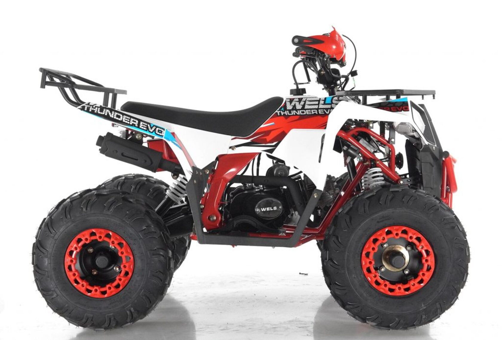 Стильная современная новинка 2019 года от компании WELS - квадроцикл для детей и подростков WELS THUNDER EVO X 125 предназначен для детей и подростков и обладает всеми необходимыми характеристиками, чтобы ребенок чувствовал себя на рулем настоящего квадроцикла, а его родители при этом были бы спокойны за безопасность юного пилота. ЛЮКСовая версия отличается от обычной наличием зеркал, дополнительной светодиодной оптики, спортивным глушителем, также квадроцикл укомплектован песочной резиной.125 кубового мотора вполне хватает для непоседливых гонщиков. Если же Вам кажется, что этого много - воспользуйтесь ограничителем скорости.Дисковые тормоза спереди и сзади обеспечат своевременную остановку перед препятствием.Защита рук в комплектации оградит ребенка от ударов веток и других помех.Песочная резина. Большие колеса 19,7-8, зад.: 18,9.5-8.Наличие укрепленных багажников спереди и сзади позволит установить на квадроцикл кофр и выезжать на природу с необходимым набором вещей и инструментов.Светодиодные фары для передвижения в темное время суток.Моточасы, светодиодные фары, звуковой сигнал, колпаки - все включено в комплектацию.Доступен в расцветках: черно-красный, бело-красный, живописно-красный, зеленый камуфляж