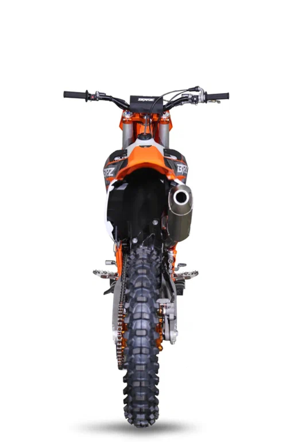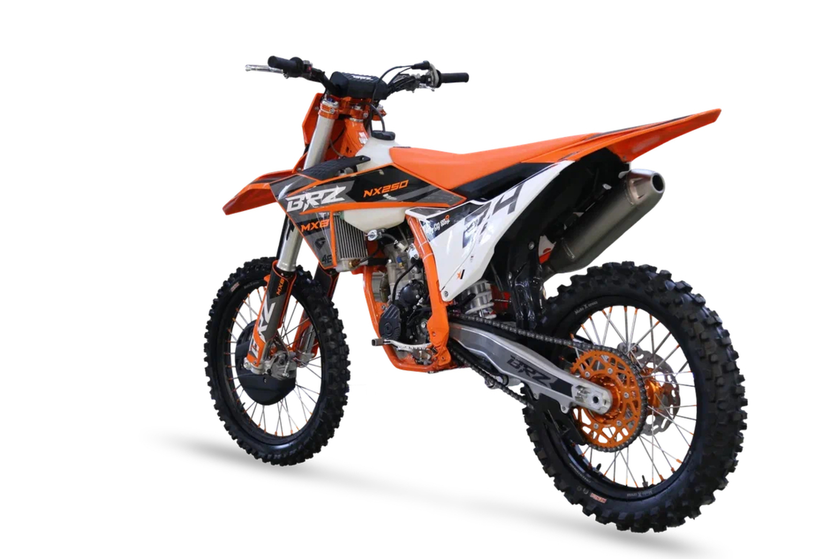 Полноразмерный кроссовый мотоцикл BRZ MX8 NX250 24 с двигателем NX250 ZS178MM-2 на карбюраторе FCR 38,выдающий мощность 44 л.с. Тип пластика КТМ 24.Характеристики:Кубатура – 250сс