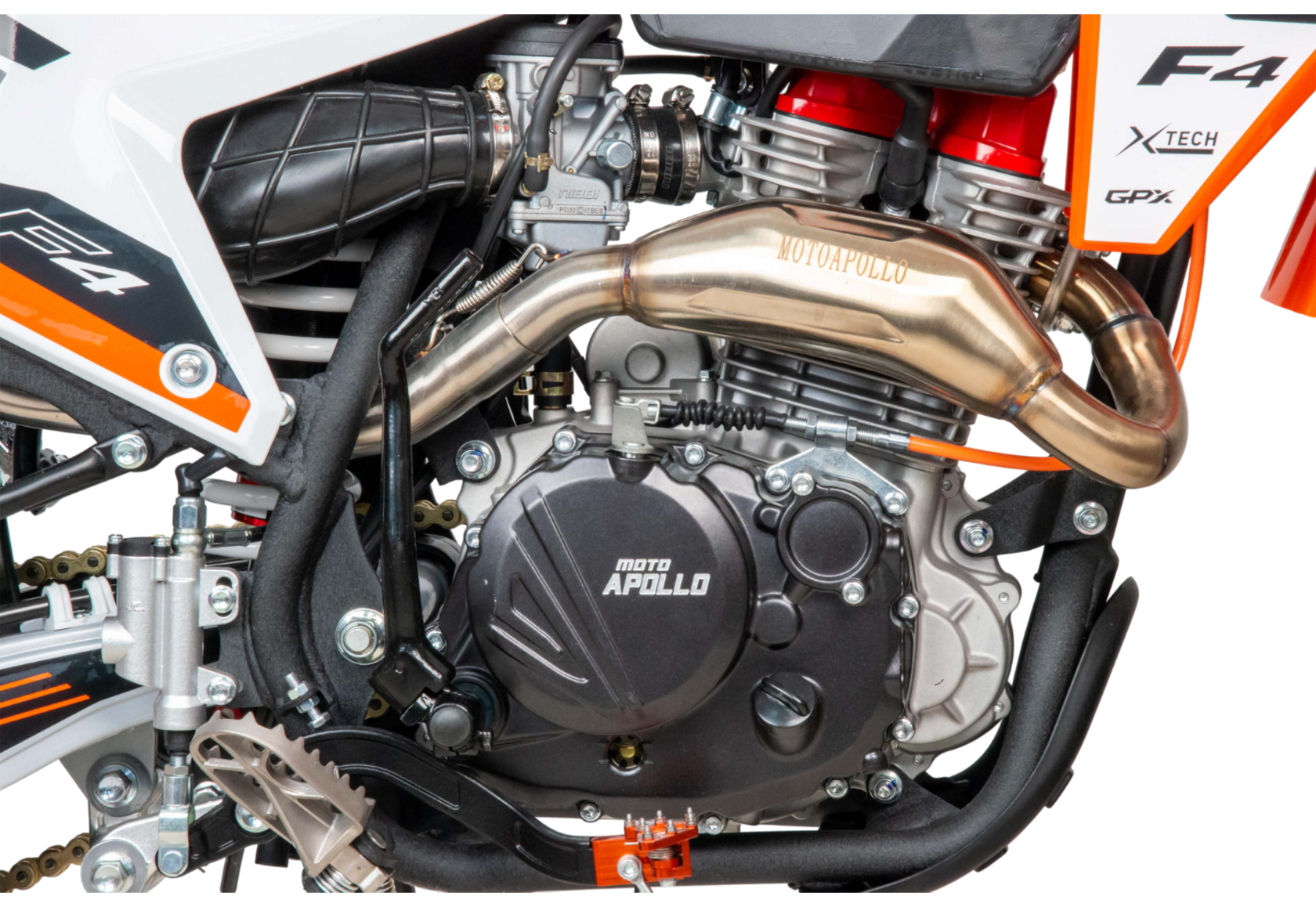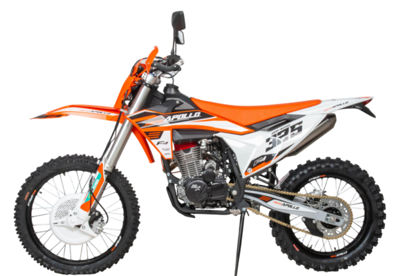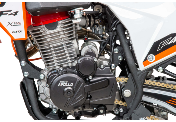 Moto Apollo F3 300 в новой, ещё более продвинутой версии — это мощный и технологичный кроссовый мотоцикл, созданный для уверенной езды по пересечённой местности. Несмотря на маркировку двигателя 176FMN, его реальный рабочий объём составляет 300 см³, а мощность достигает 27 лошадиных сил, что делает его одним из самых энерговооружённых в своём классе. Двигатель с воздушным охлаждением и цепным приводом ГРМ сочетает простоту конструкции с высокой надёжностью, а использование бензина АИ-95 обеспечивает стабильную работу и оптимальную отдачу.