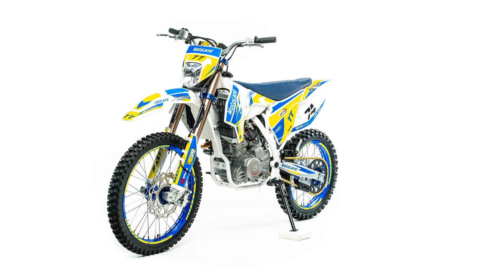 MotoLand TT 300 Новинка осени 2020 года.Надёжная техника из самых популярных компонентов оснащена Двигателем ZONGSHEN 174FMM с кикстартером и электростартером Мощностью 24 Л.С. на двигателе установлен Карбюратор NIBBI .Это полноразмерный кроссовый мотоцикл его база по осям составляет 1430 мм., и габаритами 2180х800х1300 мм. Высота по седлу составляет 950 мм., что по сравнению с Моделью XT 250 ST 21/19 ниже порядка 20 мм. Что позволяет комфортно себя чувствовать райдерам среднего роста.За счет сбалансированной базы мотоцикл имеет отличную управляемость, а конструкция рамы и особенности настройки подвески GPX способствуют максимальному поглощению неровностей дорожного покрытия, а так же усиленная прогрессия на игольчатых подшипниках.Алюминиевые обода c антибуксаторами, усиленными спицами и ступицами CNC. На кроссовой резине Yuanxing 80/100-21 / 100/90-18На мотоцикле установлена обновлённая тормозная система аналог «brembo» с медными колодками , что обеспечивает отличные тормозные характеристики. Особенностью заднего тормоза является, лапка верхнего расположения с эксцентриковой регулировкой.Выпускной патрубок с резонатором Power Bomb имеет крепления на пружинах для снижения вибрации. Глушитель с уникальным дизайном прямоточного типа, полностью алюминиевый для облегчения веса.