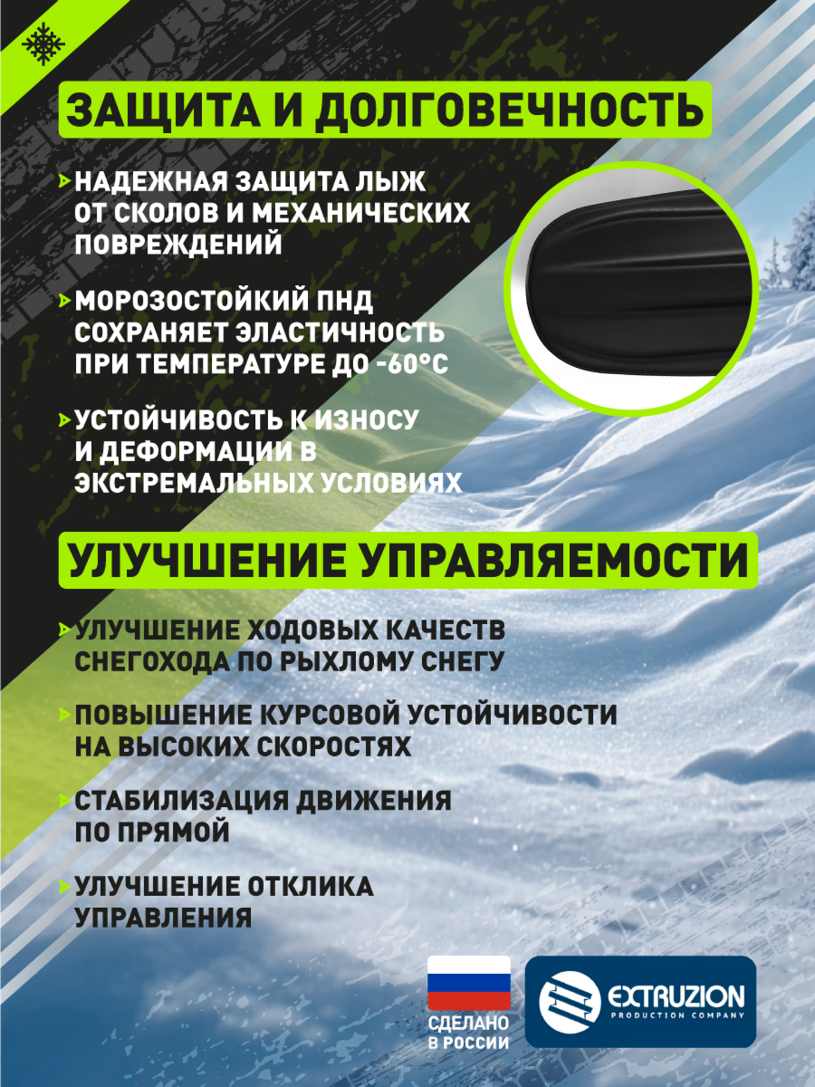 Надежная защита и долговечность. Защищает оригинальные лыжи от сколов, царапин и абразивного износа Изготовлена из морозостойкого ПНД, сохраняющего гибкость при температуре до -60C Принимает на себя основную нагрузку, значительно продлевая срок службы штатных лыж