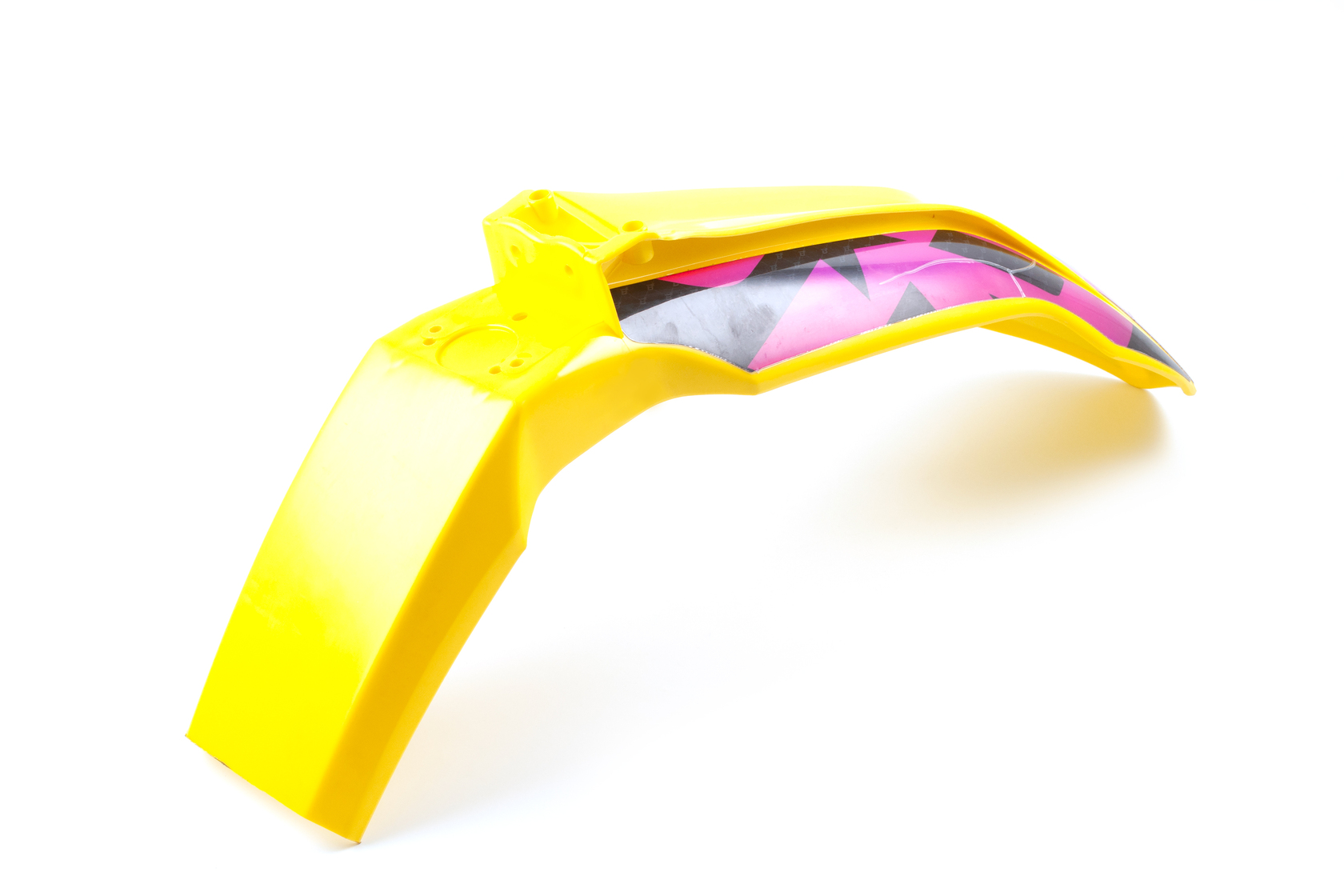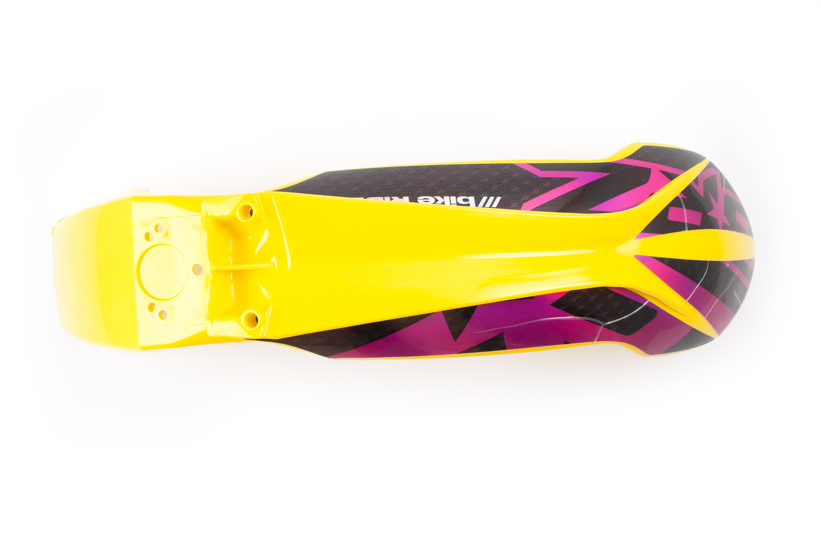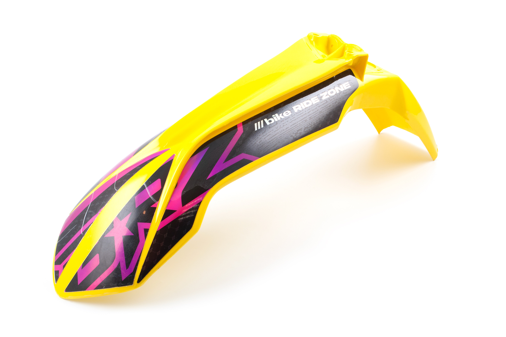Ярко-жёлтое переднее крыло с уникальными спортивными наклейками для мотоциклов KTM 2015-2016 года, а также совместимых моделей китайских эндуро на рамах K5, K7, K8. Крыло выполнено из прочного и эластичного пластика современного типа, повторяет форму и размеры оригинальной детали KTM (артикул 7770801000004), быстро и легко устанавливается на штатные места без доработок. Глянцевый жёлтый цвет с оригинальным графическим рисунком (крупные элементы розового, чёрного, надпись "bike RIDE ZONE") отлично выделяет мотоцикл среди других и подчёркивает индивидуальность.