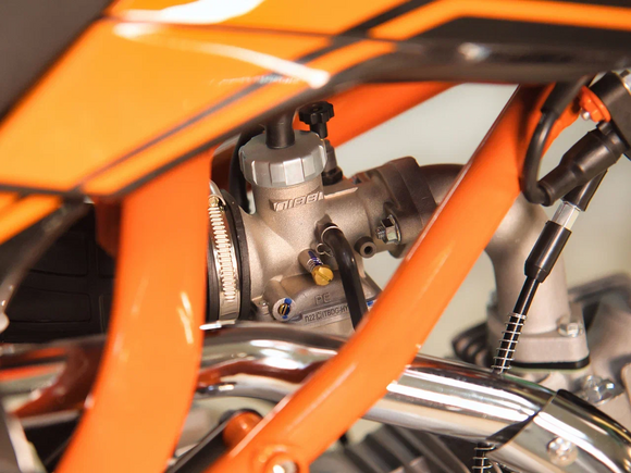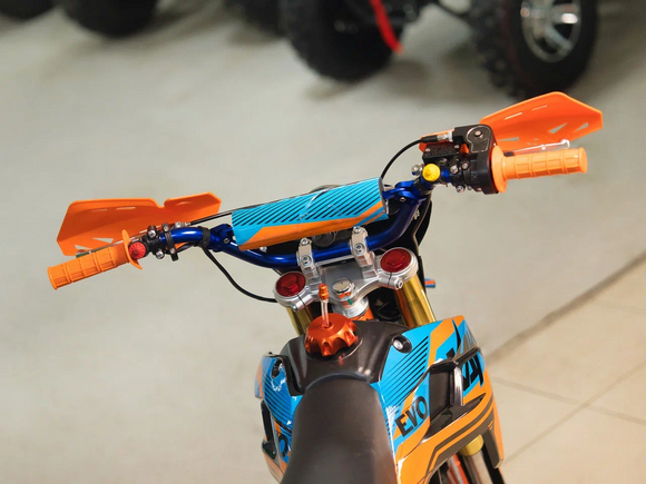 Питбайк KAYO Evolution K125EM KRZ – идеальный снаряд для наработки первого опыта в мотокроссе и эндуро, который можно использовать на лёгких кроссовых трассах и дорогах с различным покрытием. Удобный, простой и надёжный мотоцикл, который полностью оправдывает свою цену.Одноцилиндровый 4-тактный двигатель воздушного охлаждения объёмом 125 см3, выдаёт 9 л.с. Карбюратор NIBBI PE19 обеспечивает бесперебойную работу техники в самых жёстких условиях эксплуатации, простоту и лёгкость в обслуживании, а также неприхотливость к качеству топлива. Питбайк оснащён механической 4-ступенчатой коробкой передач с формулой “N-1-2-3-4”.Мотоцикл имеет вес всего 78 кг. Усиленная рама из хром-молибденового сплава и подвеска позволяют эффективно амортизировать удары при езде по неровностям и препятствиям на трассе. Передняя подвеска — телескопическая вилка перевёрнутого типа длиной 770 мм, задняя — моноамортизатор длиной 360 мм. Оба компонента подвески являются нерегулируемыми. Рама и пластик являются собственной разработкой производителя. Мотоцикл оснащён классическими стальными спицованными колёсами диаметром 17 дюймов спереди и 14 дюймов сзади. Эффективное и безопасное замедление с любых скоростей обеспечивают гидравлические дисковые тормоза с лепестковыми дисками.Высококачественная износостойкая резина с развитым протектором отлично держит дорогу на различных типах покрытия. Байк оснащён как системой запуска двигателя при помощи кнопки электростартера, так и рычагом кик-стартера. Питбайк имеет вместительный топливный бак на 5,7 л, что гораздо больше, нежели у других байков этого класса.Питбайк оснащён защитой кистей рук, стальной защитой картера и яркой линзованной фарой. Он имеет агрессивный дизайн с яркой и контрастной графикой. Если вы ищете послушный, компактный, шустрый и красивый питбайк, считайте, что вы его нашли. Это один из лучших мотоциклов для обучения и первых шагов в эндуро и мотокроссе. Он отлично подойдёт как для гонок на трассе, так и для покатушек по пересечённой местности.