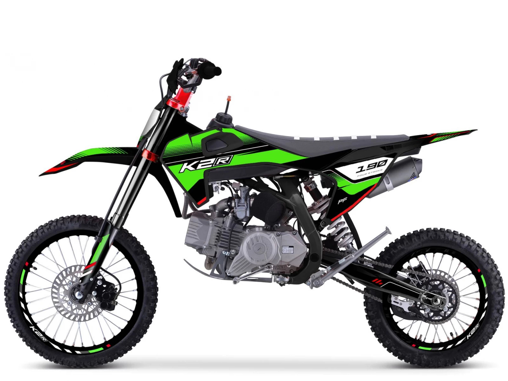 K2R PF 190 - мощный спортивный питбайк «из коробки» готовый к участию в гонках.В раме питбайка установлен надежный 1-цилиндровый двигатель Zongshen, работающий с 5-ступенчатой КПП;17 и 14-дюймовые спицованные колеса;регулируемая перевернутая вилка;полностью регулируемый DNM амортизатор; высота сиденья составляет 845 миллиметров;дорожный просвет равен 320 мм.