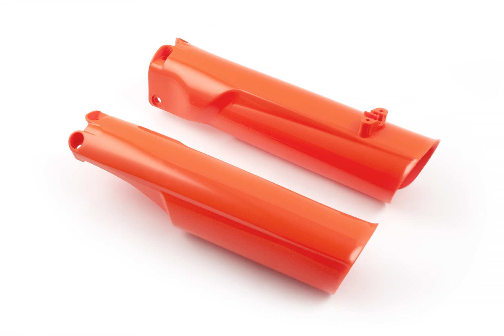 Универсальные защитные накладки на вилку оранжевого цвета полного охвата (360). Обеспечивают максимальную защиту перьев вилки от механических повреждений, грязи, песка и абразивного износа. Изготовлены из ударопрочного пластика. Полный аналог оригинальной детали KTM. Подходят для вилок диаметром 48 мм различных производителей (HT, WP, MNT). Прямая установка без доработок.